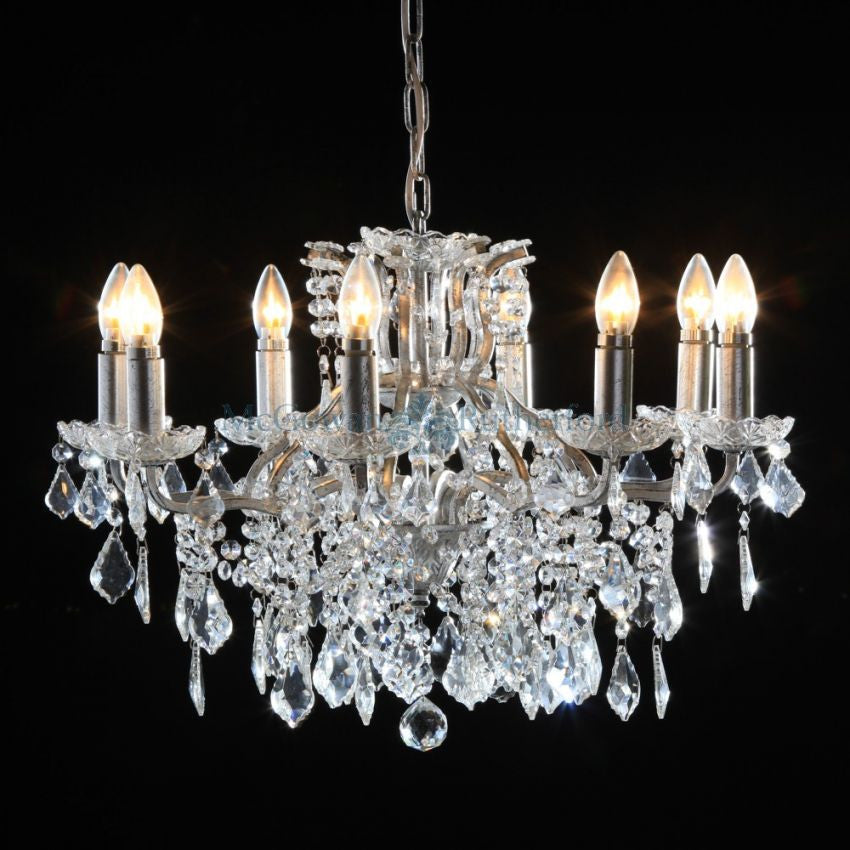 Lorelei: 6 branch large shallow crystal glass salon chandelier with antique silver frame.