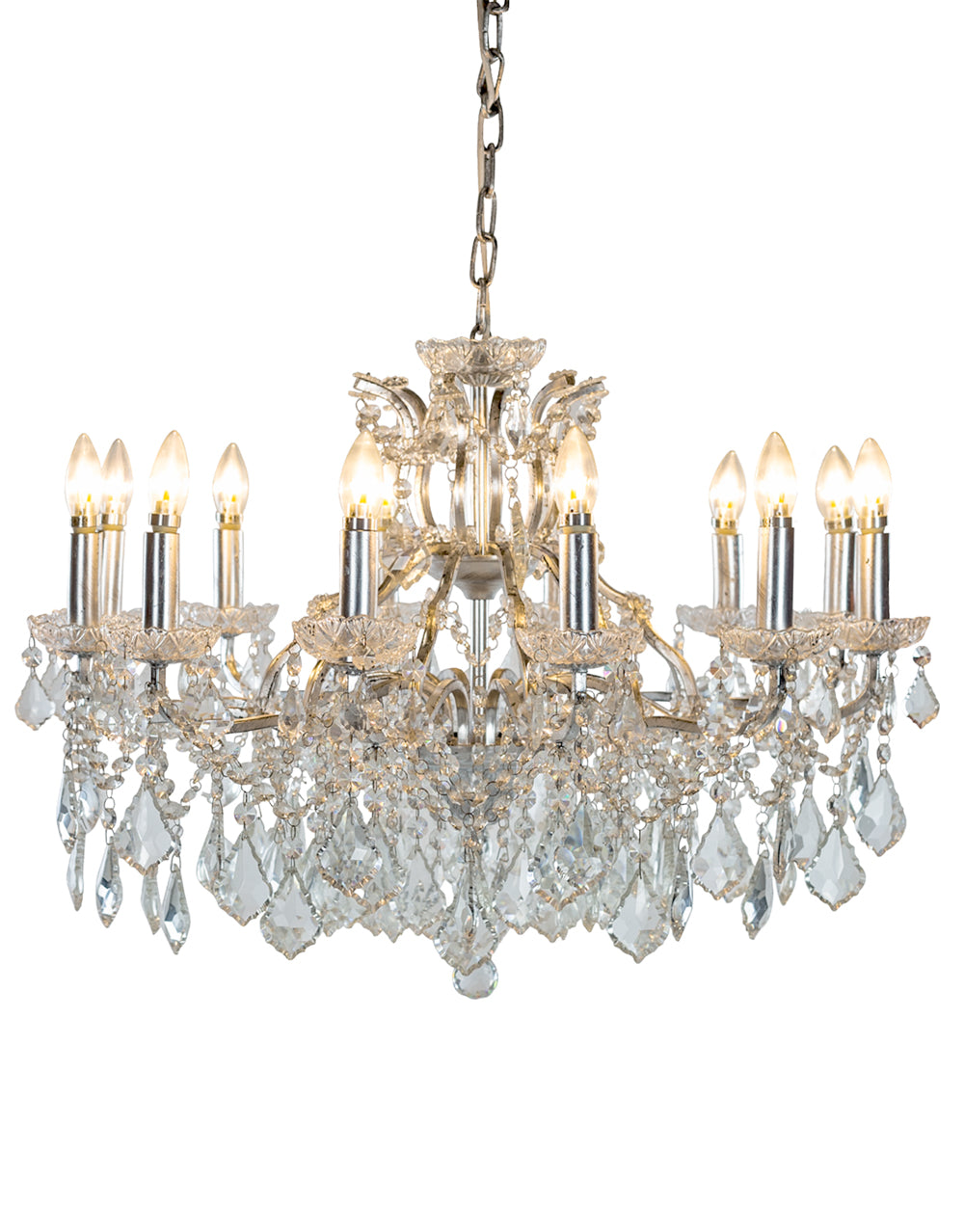 Nitty-gritty: 12 branch large shallow crystal glass chandelier with antique silver frame.
